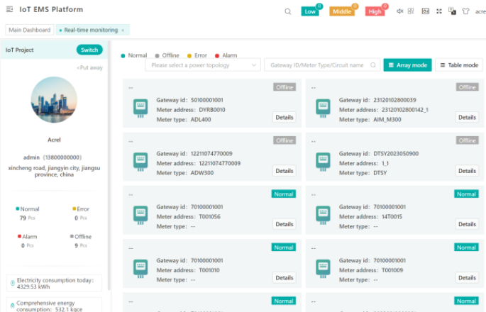 محصولات پروژه: انرژی سنج هوشمند اینترنت اشیاء چند مداره ADW210، کنتور انرژی هوشمند بی سیم سه فاز ADW300، کنتور انرژی ریلی ریلی سه فاز ADL400، دروازه هوشمند اینترنت اشیا AWT100، پلت فرم Acrel IoT-EMS